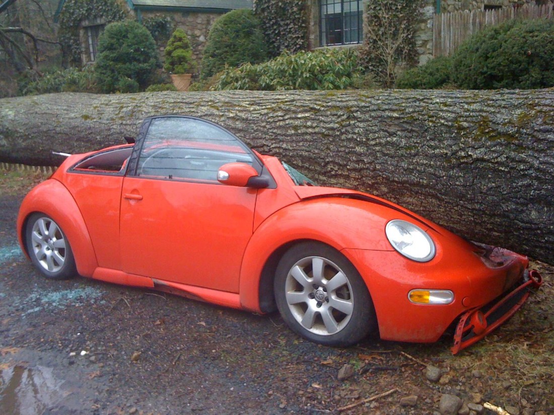 I always parked there next to the tree, parallel to the little street, as there was no room in the driveway for two cars. The white oak fell right down the middle, crushing my VW Bug lengthwise. Enough room remained on each side of the rough trunk such that, while both the front and rear windows were smashed, the glass of the door windows on each side of the car stood whole and uncracked. I pulled out some jackets, some CDs and whatever else I could reach and find around the tree’s bulk. The rain soaked me through and I went back to my bed, dropping my sodden pile of recovered items just inside the front door.